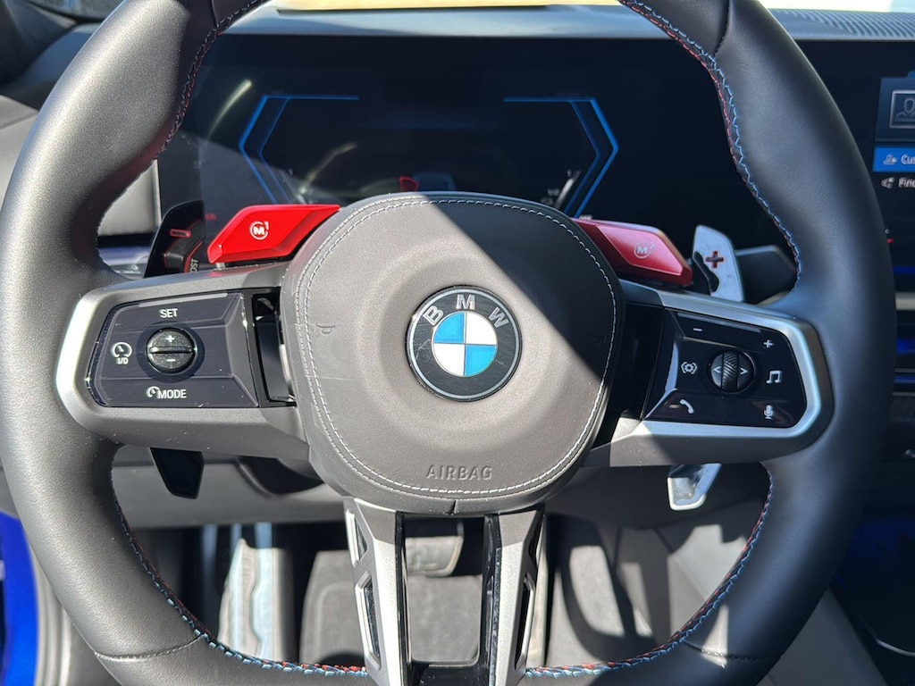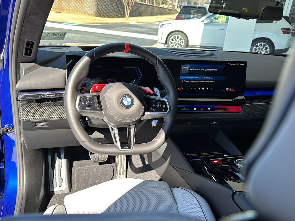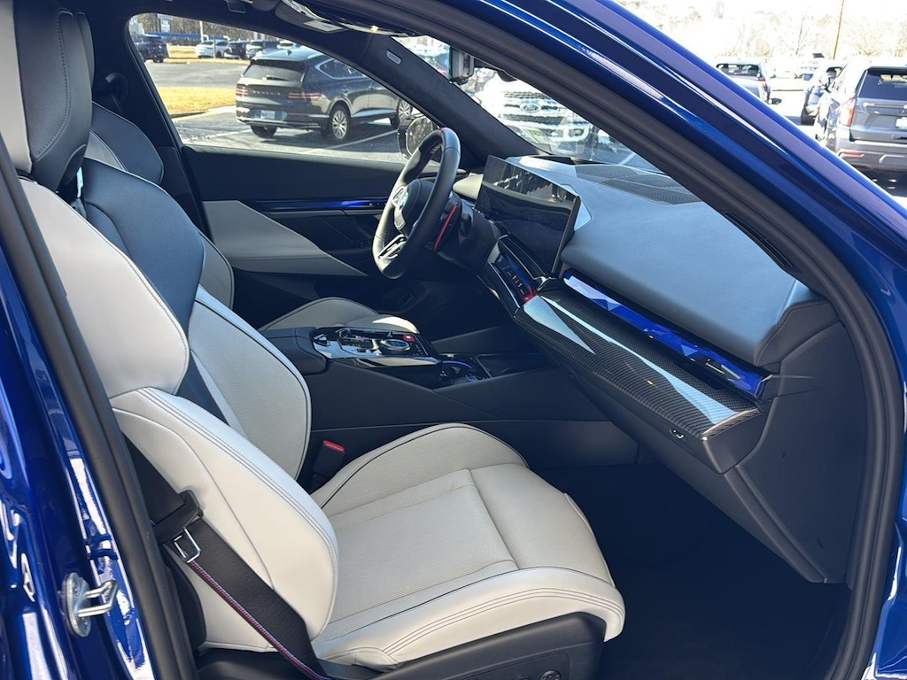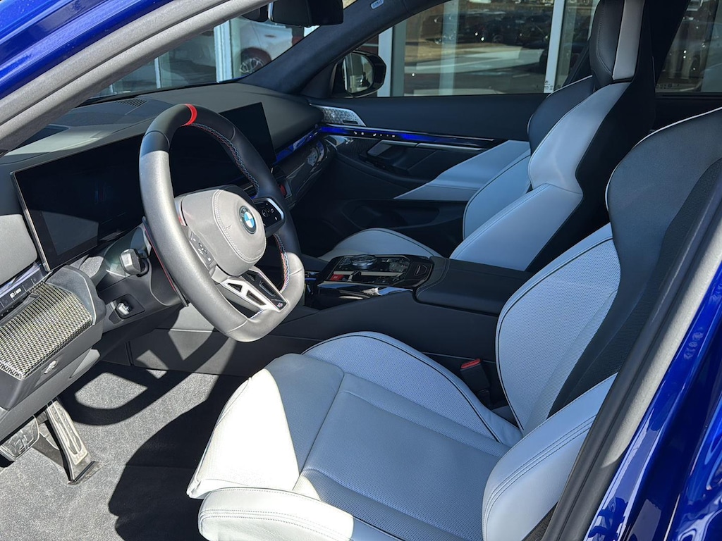 This 2026 BMW M5 Sedan is Marina Bay Blue Metallic with a Silver/Black Extended Merino Leather Interior. It comes very well equipped with a Driving Assistance Professional (Driving Assistant Professional, Traffic Jam Assistant, Lane Change Assistant, Partial Automated Driving), Executive Package (BMW Iconic Glow Kidney Grille, Power Rear Sunshade and Rear Side Window Shade, Front Ventilated Seats, Front and Rear Heated Seats, Interior Camera, Parking View w/ 3d View, Parking Assistant Plus), Carbon Fiber Silver Thread High Gloss Trim, 20"/21" M Dual-Spoke Dark Grey Alloy Wheels, M Drive Professional, Comfort Access Keyless Entry, Hi-Fi Sound System, Automatic Transmission, Navigation System, ConnectedDrive Services, Connected Package Pro, Universal Garage Door Opener, Floor Mats, Tire Pressure Monitor, Heated Steering Wheel, Apple CarPlay/Android Auto Compatibility, Remote Services, Wireless Charging, Decoding for No-Dazzle High Beams, Adaptive Full LED Lights, M Drivers's Package, M Compound Brakes with Red Calipers, Mobility Kit, NEMA 5-15/14-50 Adapter Bundle, Flexible Fast Charger, Active Park Distance Control with Side Protection, Personal eSIM 5G, Wireless Device Charging, Speed Limit Assistant, Travel and Comfort System, M Seat Belts, Active Blind Spot Detection, Foward Collision Mitigation, Lane Keeping Assistant, and Daytime Driving Lights. This 2026 BMW M5 comes with the balance of a BMW Limited Mileage Warranty with coverage until 11/24/2029 or 50,000 miles. Please ask for Internet Sales to receive this special internet offer!