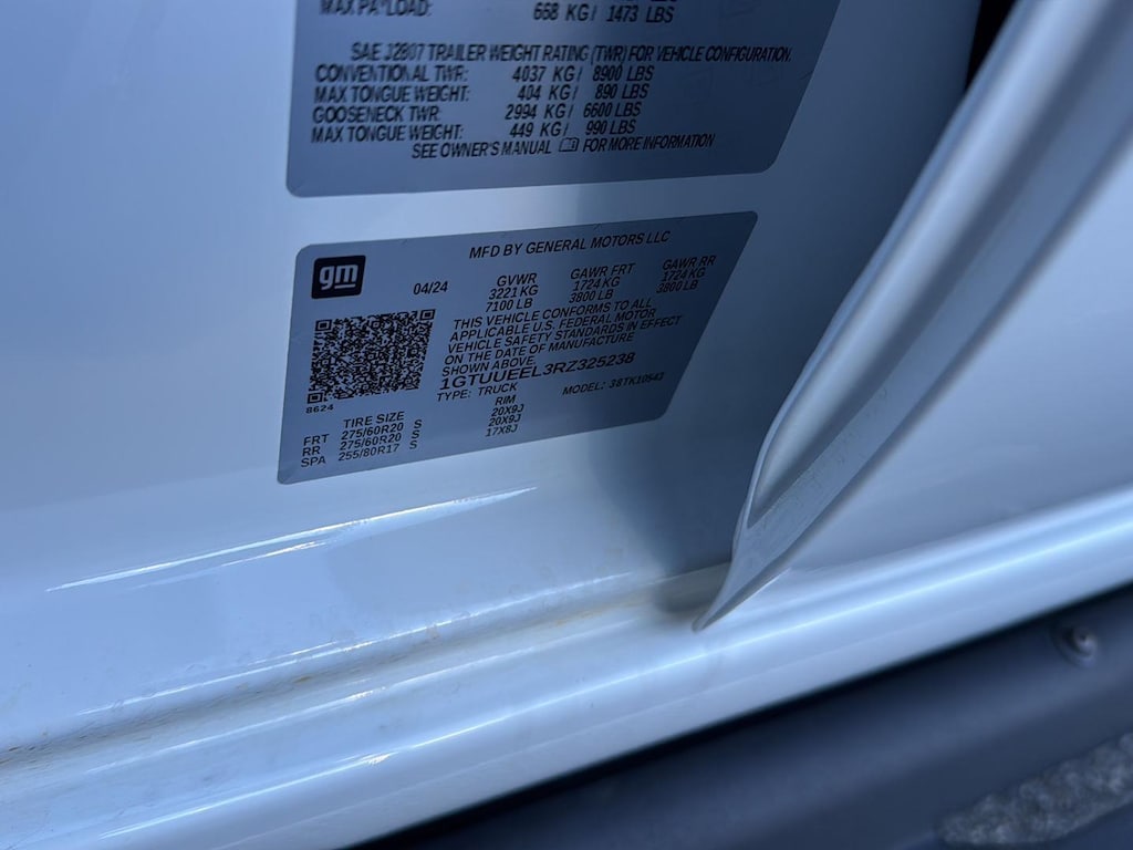 EMISSIONS, FEDERAL REQUIREMENTS, ENGINE, 6.2L ECOTEC3 V8, TRANSMISSION, 10-SPEED AUTOMATIC WITH ELECTRONIC PRECISION SHIFT, ELECTRONICALLY CONTROLLED, GVWR, 7100 LBS. (3221 KG), REAR AXLE, 3.23 RATIO, WHEELS, 20 X 9 (50.8 CM X 22.9 CM) MACHINED ALUMINUM, TIRES, 275/60R20SL ALL-TERRAIN, BLACKWALL, TIRE, SPARE 255/80R17SL ALL-SEASON, BLACKWALL, SUMMIT WHITE, SEATS, FRONT BUCKET, JET BLACK WITH KALAHARI ACCENTS, PERFORATED LEATHER FRONT SEAT TRIM, AUDIO SYSTEM, 13.4 DIAGONAL PREMIUM GMC INFOTAINMENT SYSTEM WITH GOOGLE BUILT IN APPS SUCH AS NAVIGATION AND VOICE ASSISTANCE, INCLUDES COLOR TOUCH-SCREEN, MULTI-TOUCH DISPLAY, AM/FM STEREO, AT4 PREMIUM PACKAGE, TECHNOLOGY PACKAGE, AT4 PREFERRED PACKAGE, COOLING, EXTERNAL ENGINE OIL COOLER, COOLING, AUXILIARY EXTERNAL TRANSMISSION OIL COOLER, ALTERNATOR, 170 AMPS, ACTIVE EXHAUST, DUAL, SPORT-MODE ENABLED, SUNROOF, POWER, LPO, SPORT STEP, BLACK, WINDOW, POWER, REAR SLIDING WITH REAR DEFOGGER, MULTICOLOR 15 DIAGONAL HEAD-UP DISPLAY, UNIVERSAL HOME REMOTE, STEERING COLUMN LOCK, ELECTRICAL, REAR CAMERA MIRROR, INSIDE REARVIEW AUTO-DIMMING, BED VIEW CAMERA